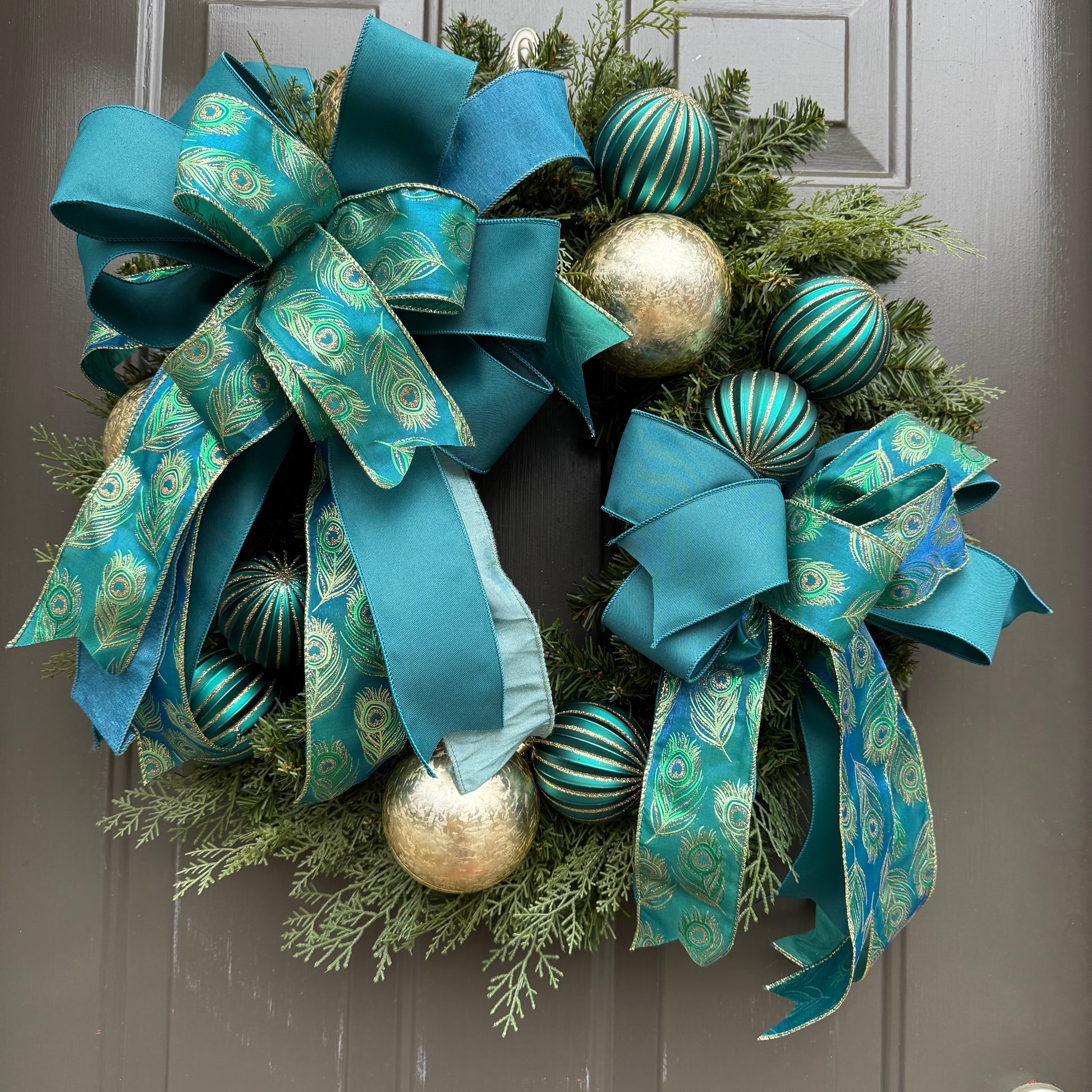 Crafted with lush evergreen textures, high-quality teal ribbon, and metallic gold and teal ornaments, this wreath brings a refined and modern feel to winter decorating. Two oversized hand-tied bows—featuring rich solid teal ribbon and detailed peacock patterned ribbon—add movement, dimension, and a custom designer look.